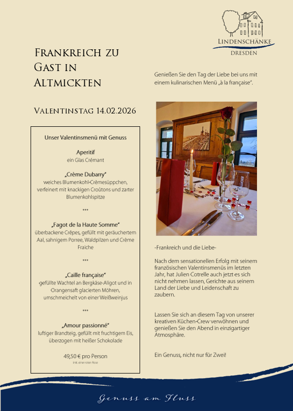 Genießen Sie den Tag der Liebe bei uns mit einem kulinarischen Menü "á la francaise".